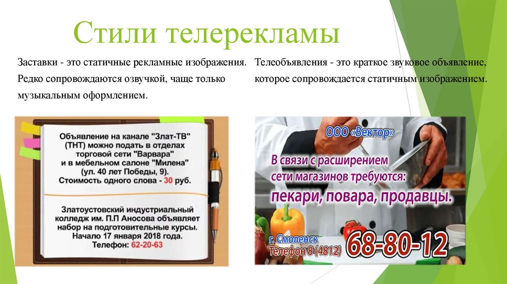 Стили телерекламыЗаставки - это статичные рекламные изображения. Телеобъявления - это краткое звуковое объявление,