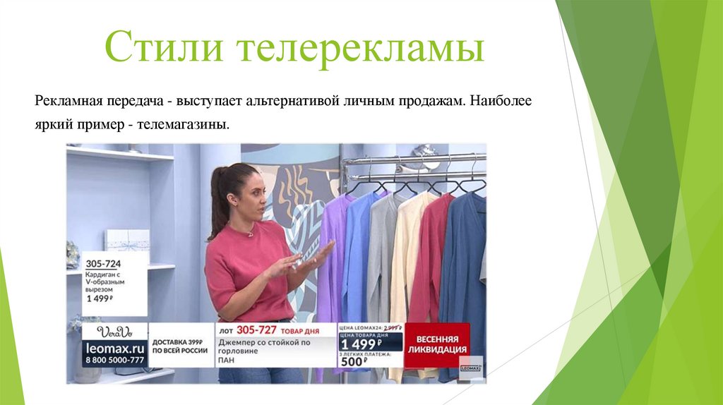 Стили телерекламыРекламная передача - выступает альтернативой личным продажам. Наиболее