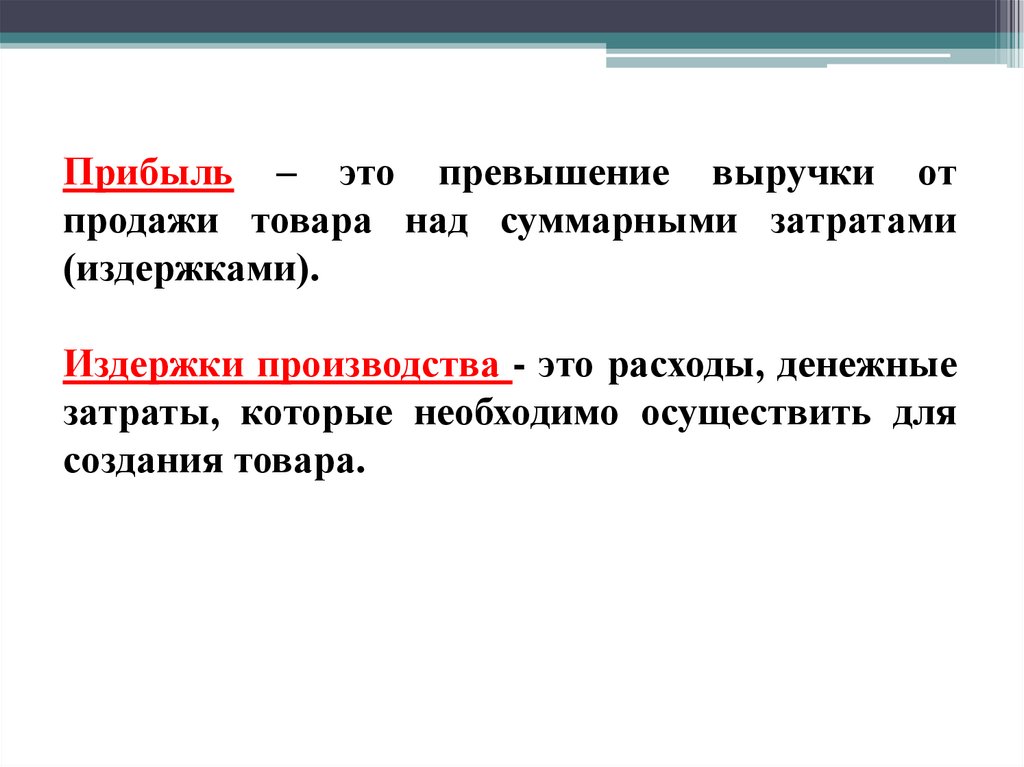 Прибыль – это превышение выручки отпродажи товара над суммарными затратами