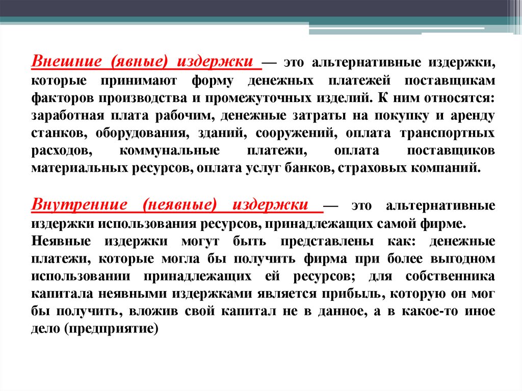Внешние (явные) издержки — это альтернативные издержки,которые принимают форму денежных платежей поставщикам