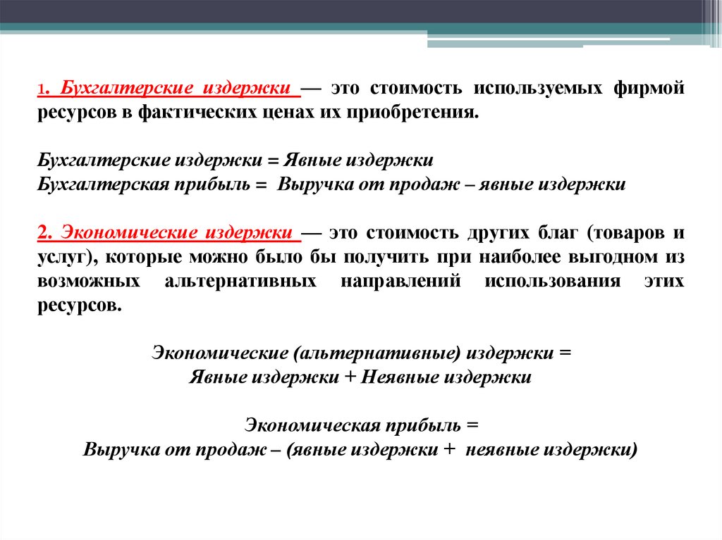 1. Бухгалтерские издержки — это стоимость используемых фирмойресурсов в фактических ценах их приобретения.