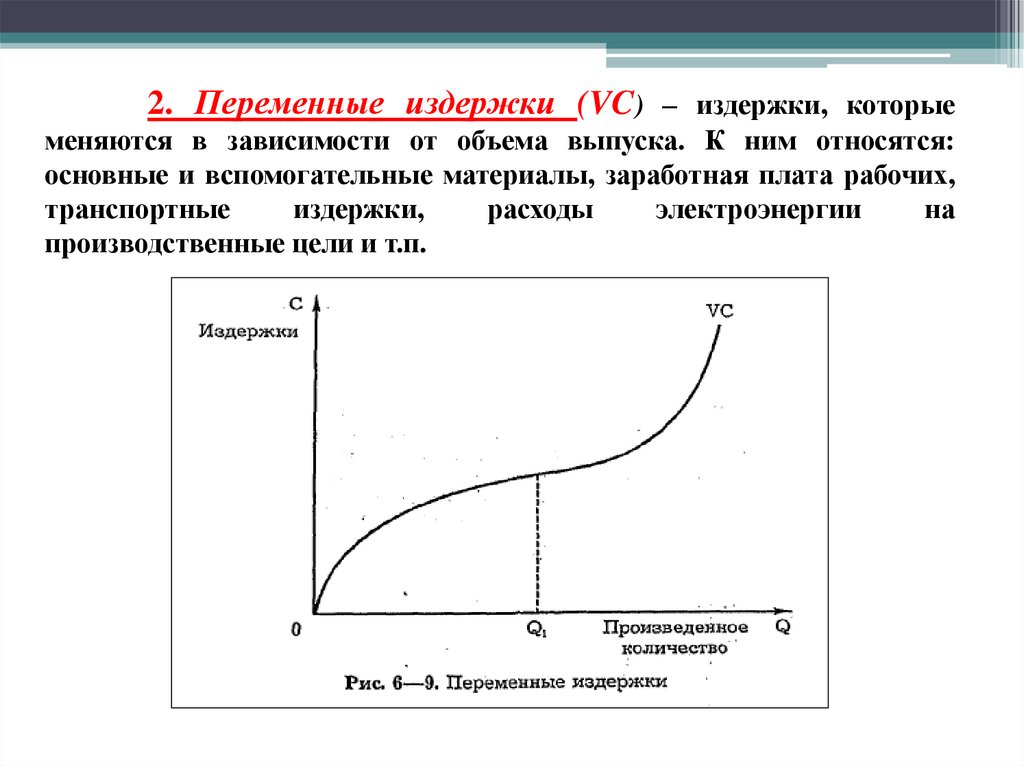 2. Переменные издержки (VC) – издержки, которыеменяются в зависимости от объема выпуска. К ним относятся:
