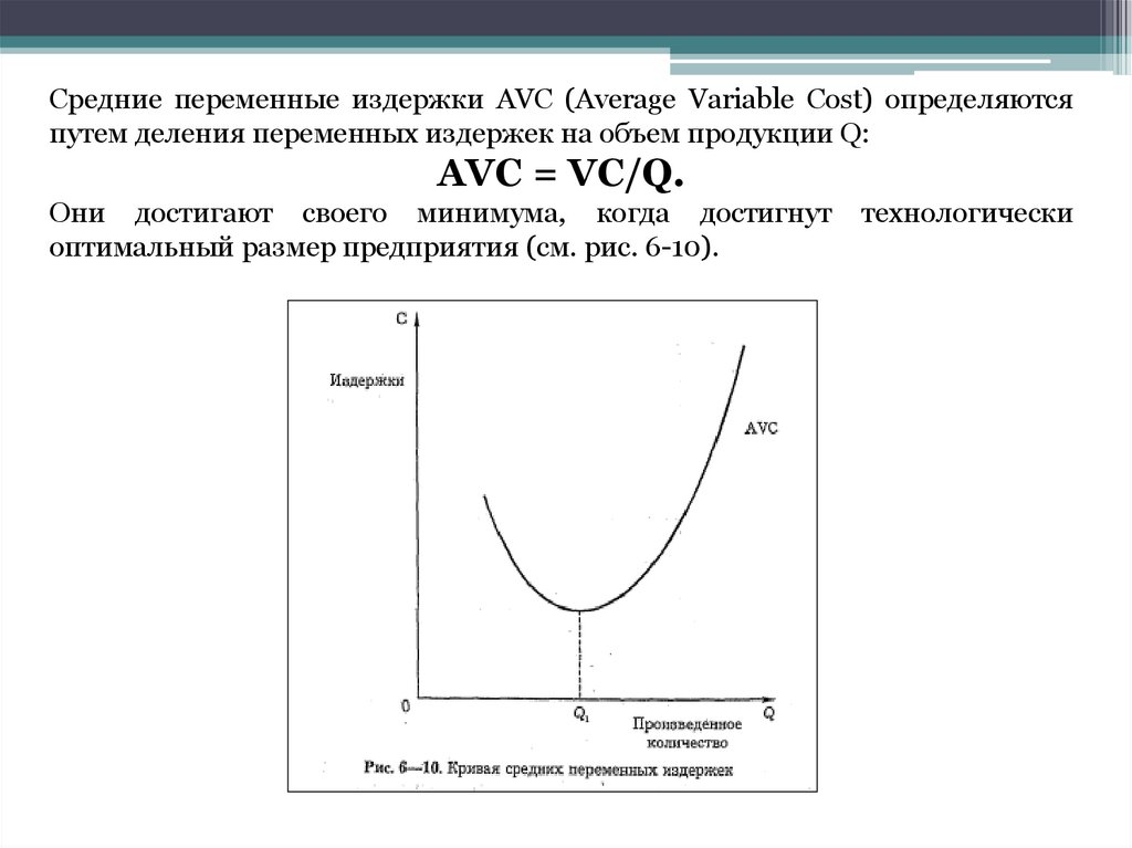 Средние переменные издержки AVC (Average Variable Cost) определяютсяпутем деления переменных издержек на объем продукции Q: