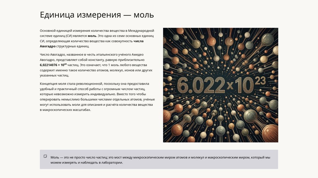 Моль — это не просто число частиц; это мост между микроскопическим миром атомов и молекул и макроскопическим миром, который мы