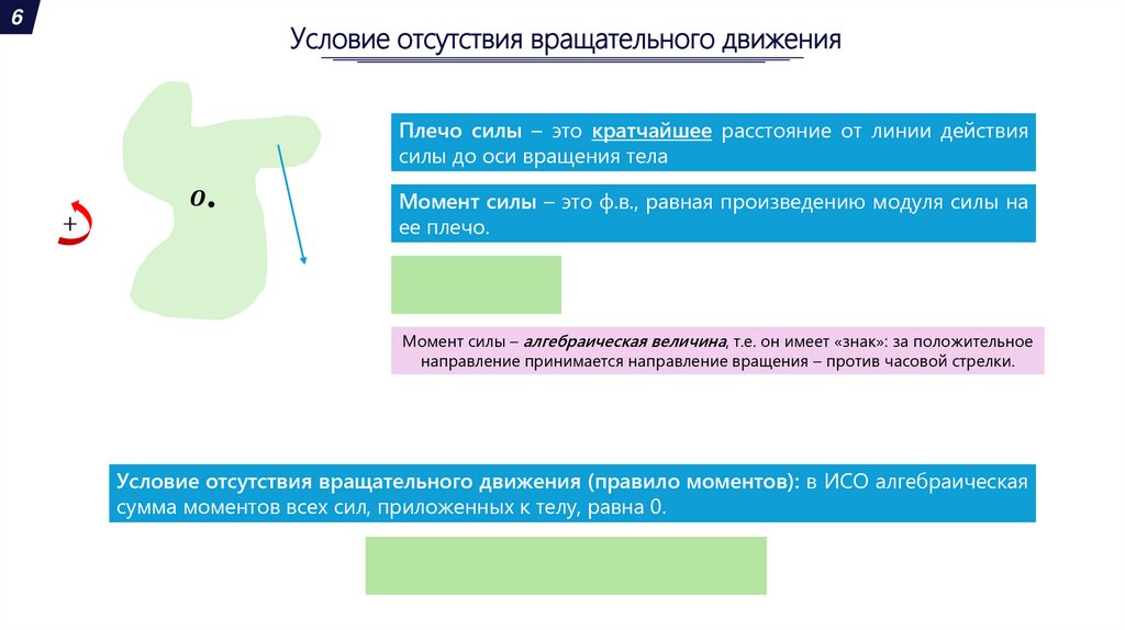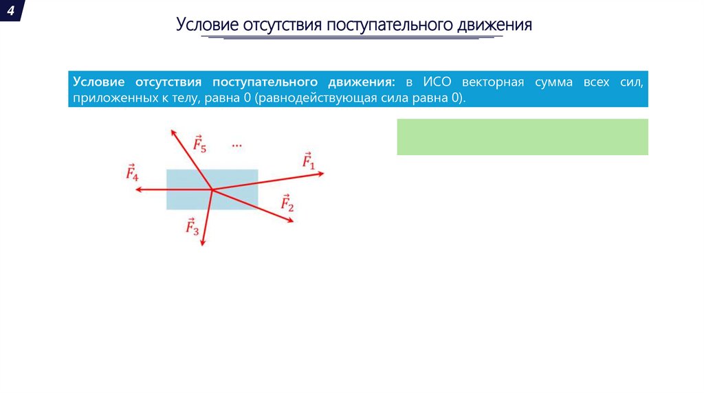 Условие отсутствия поступательного движения: в ИСО векторная сумма всех сил,