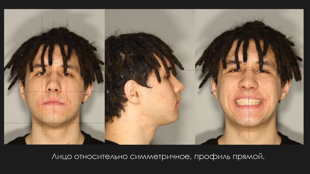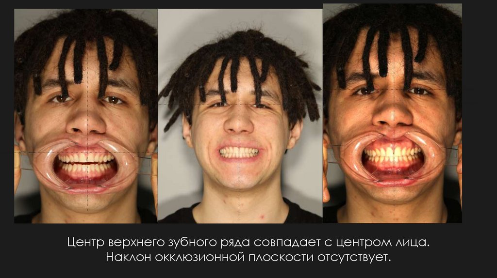 Центр верхнего зубного ряда совпадает с центром лица.Наклон окклюзионной плоскости отсутствует.