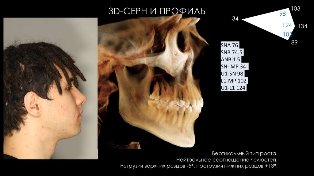 Ретрузия верхних резцов -5°, протрузия нижних резцов +13°.
