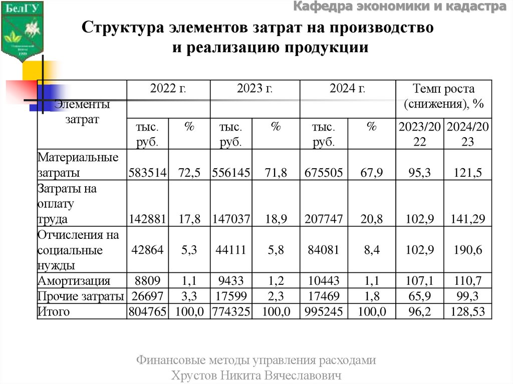 Кафедра экономики и кадастраСтруктура элементов затрат на производство