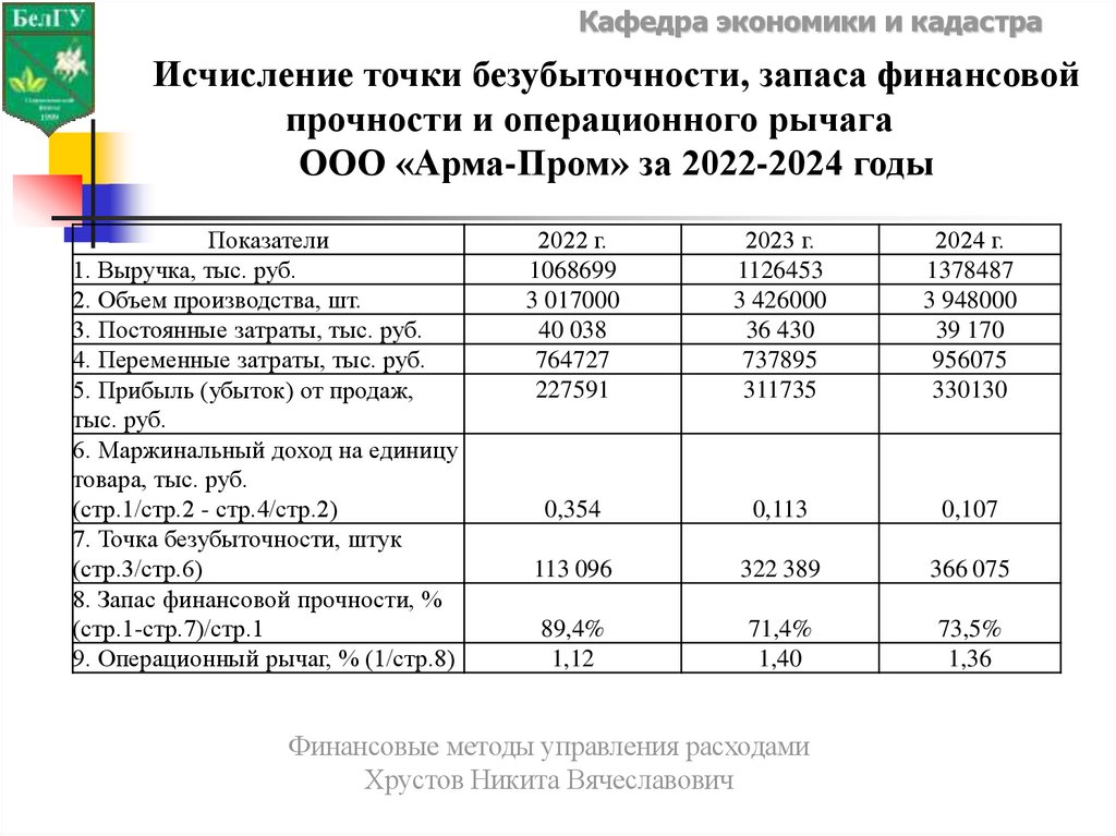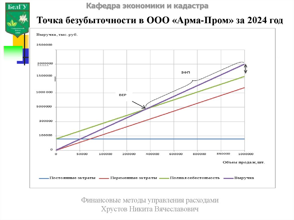 Кафедра экономики и кадастраТочка безубыточности в ООО «Арма-Пром» за 2024 год