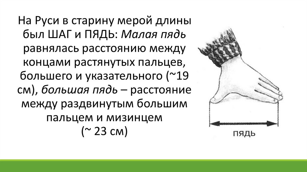 На Руси в старину мерой длиныбыл ШАГ и ПЯДЬ: Малая пядь