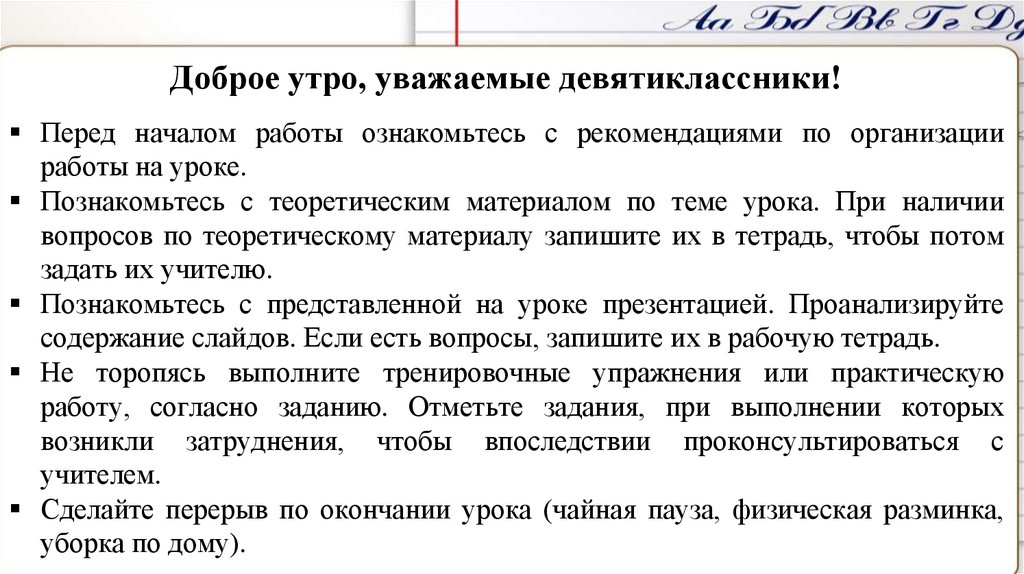 Доброе утро, уважаемые девятиклассники!Перед началом работы ознакомьтесь с рекомендациями по организации