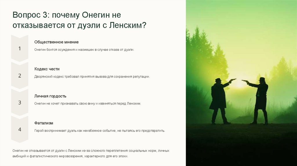 Вопрос 3: почему Онегин неотказывается от дуэли с Ленским?