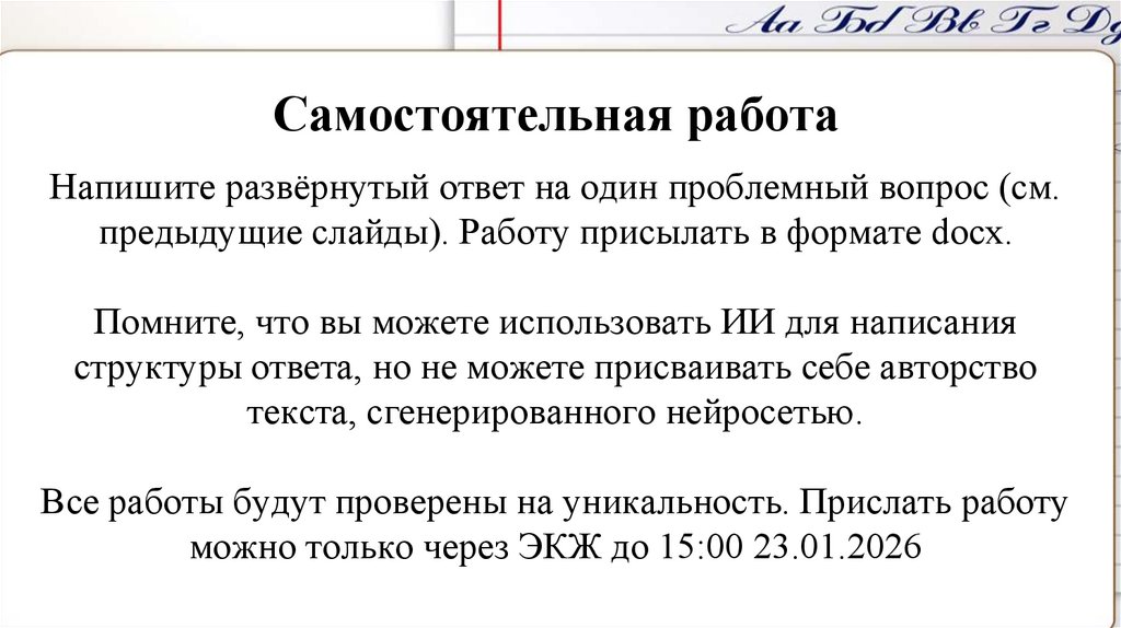 Самостоятельная работаНапишите развёрнутый ответ на один проблемный вопрос (см.