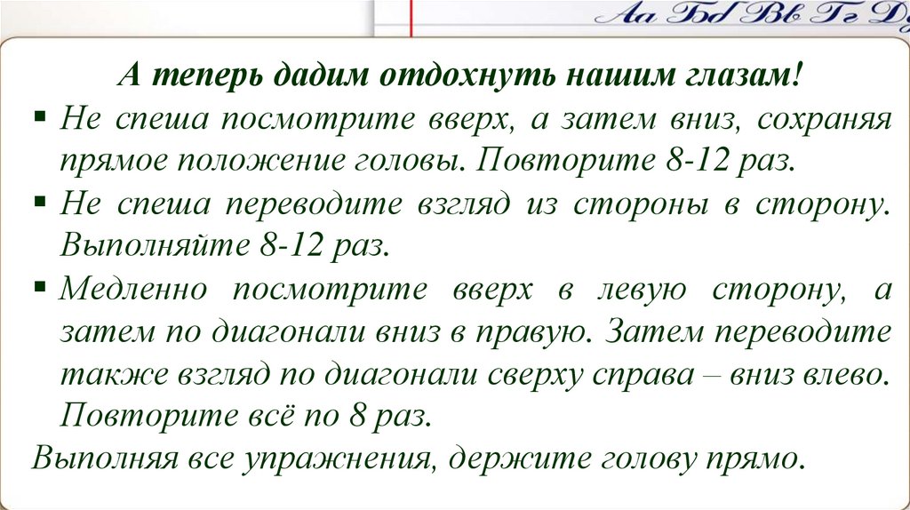 А теперь дадим отдохнуть нашим глазам!Не спеша посмотрите вверх, а затем вниз, сохраняя