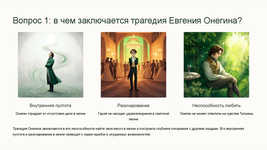 Вопрос 1: в чем заключается трагедия Евгения Онегина?Внутренняя пустота