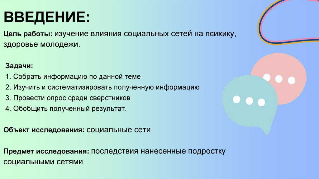 ВВЕДЕНИЕ:Цель работы: изучение влияния социальных сетей на психику,