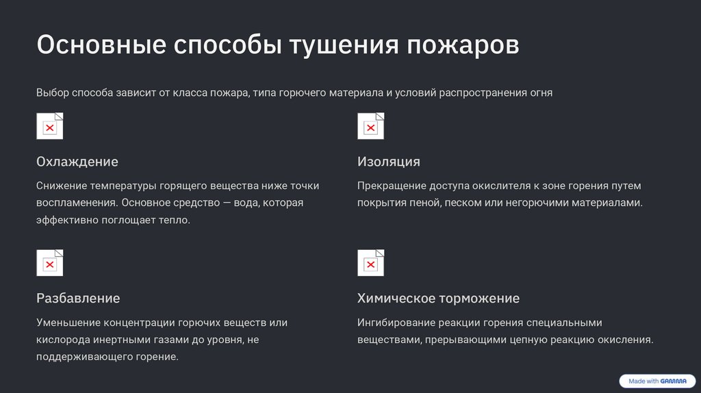 Основные способы тушения пожаровВыбор способа зависит от класса пожара, типа горючего материала и условий распространения огня