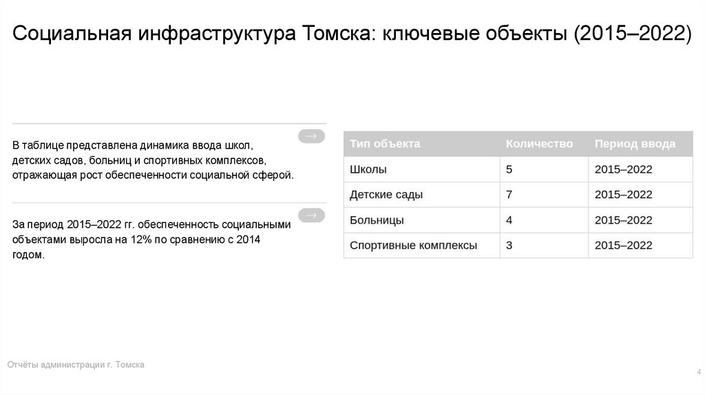 Социальная инфраструктура Томска: ключевые объекты (2015–2022)В таблице представлена динамика ввода школ,