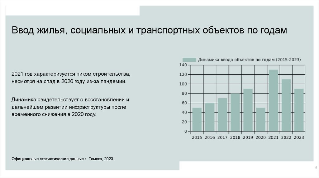 Ввод жилья, социальных и транспортных объектов по годам2021 год характеризуется пиком строительства,