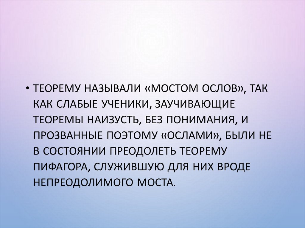 • ТЕОРЕМУ НАЗЫВАЛИ «МОСТОМ ОСЛОВ», ТАККАК СЛАБЫЕ УЧЕНИКИ, ЗАУЧИВАЮЩИЕ