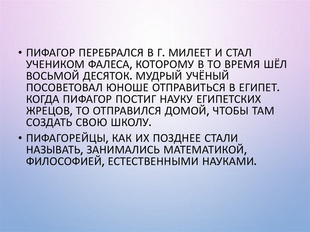 • ПИФАГОР ПЕРЕБРАЛСЯ В Г. МИЛЕЕТ И СТАЛУЧЕНИКОМ ФАЛЕСА, КОТОРОМУ В ТО ВРЕМЯ ШЁЛ