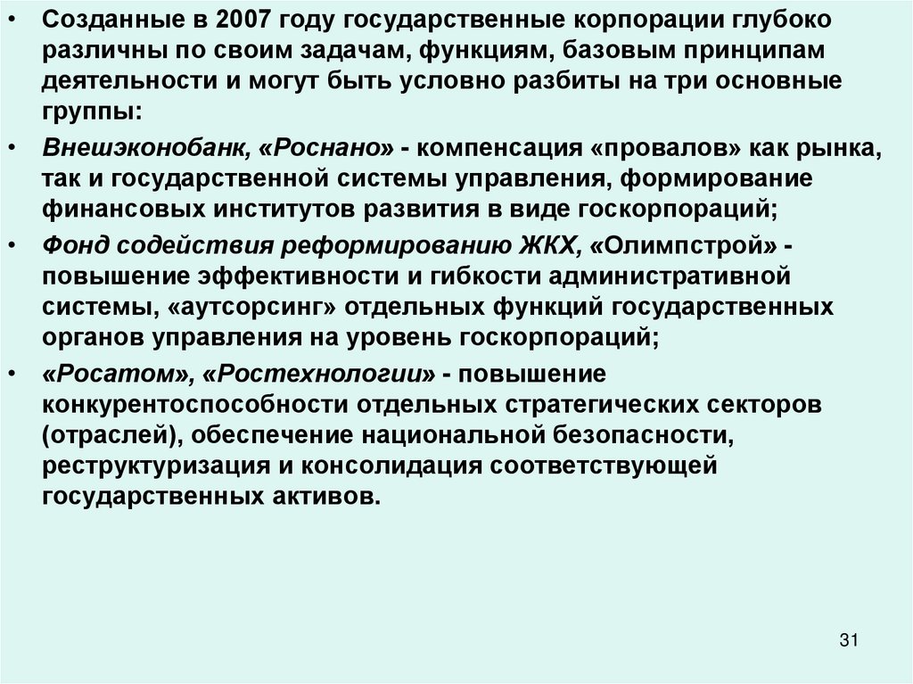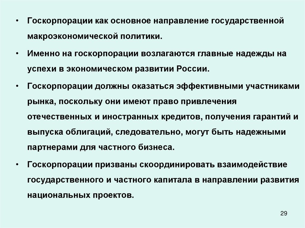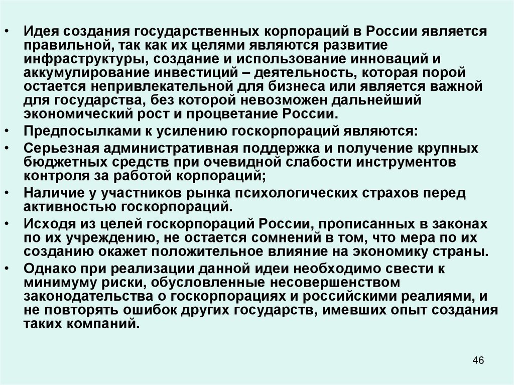 • Идея создания государственных корпораций в России являетсяправильной, так как их целями являются развитие