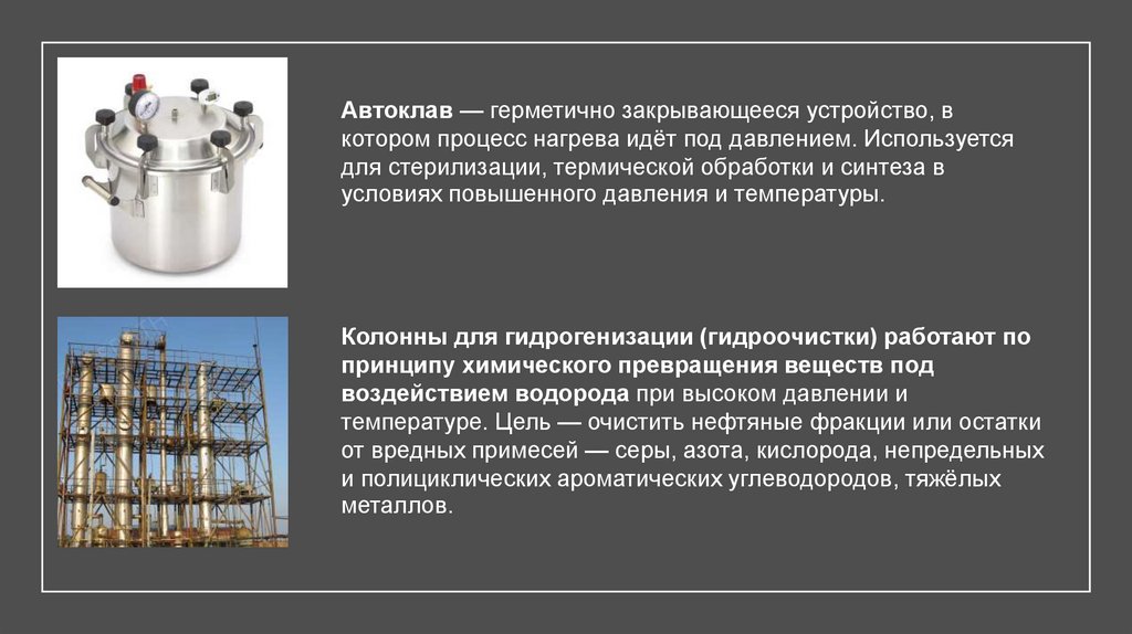 Автоклав — герметично закрывающееся устройство, вкотором процесс нагрева идёт под давлением. Используется