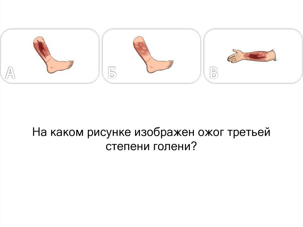 На каком рисунке изображен ожог третьейстепени голени?