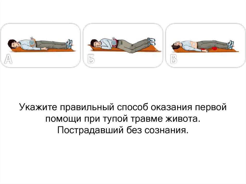Укажите правильный способ оказания первойпомощи при тупой травме живота.