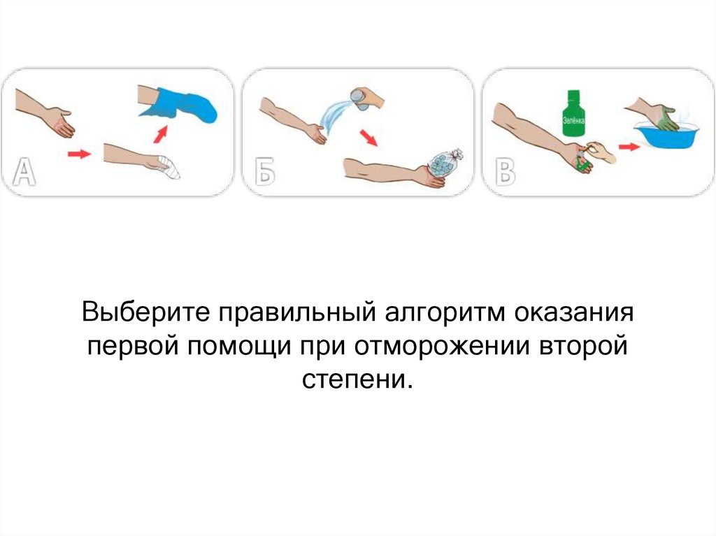 Выберите правильный алгоритм оказанияпервой помощи при отморожении второй