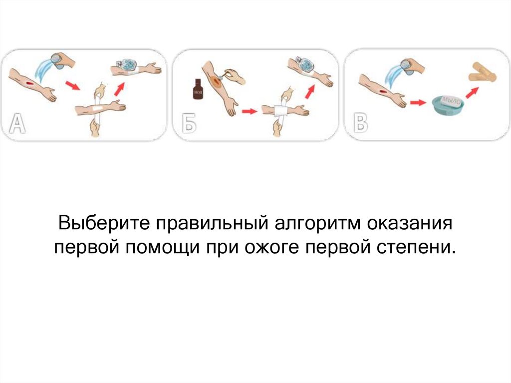 Выберите правильный алгоритм оказанияпервой помощи при ожоге первой степени.