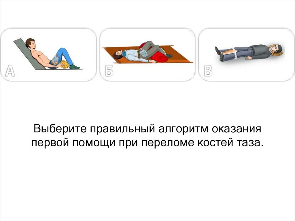 Выберите правильный алгоритм оказанияпервой помощи при переломе костей таза.