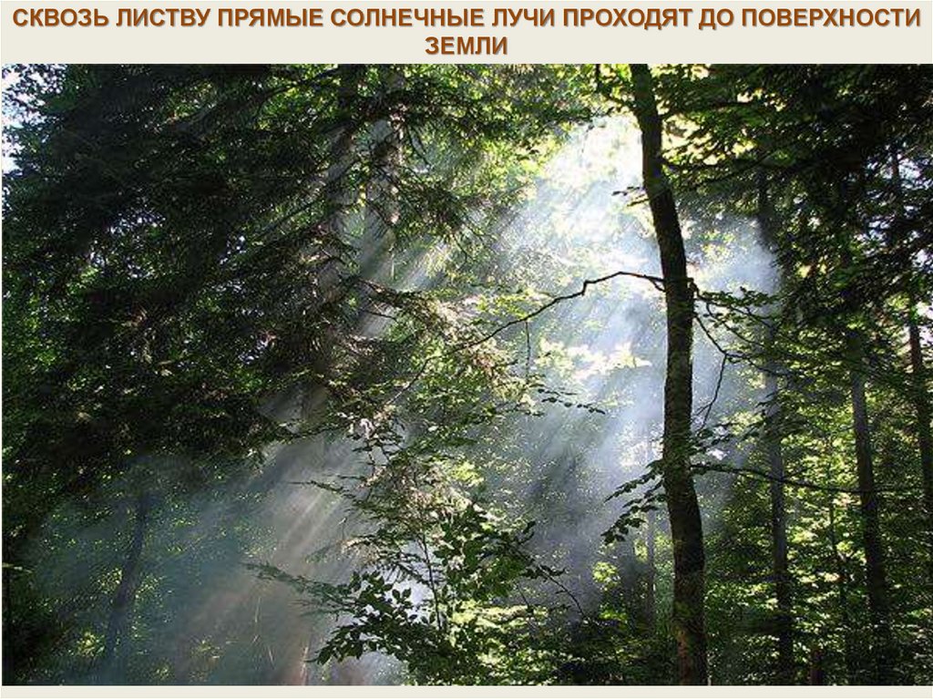 СКВОЗЬ ЛИСТВУ ПРЯМЫЕ СОЛНЕЧНЫЕ ЛУЧИ ПРОХОДЯТ ДО ПОВЕРХНОСТИЗЕМЛИ