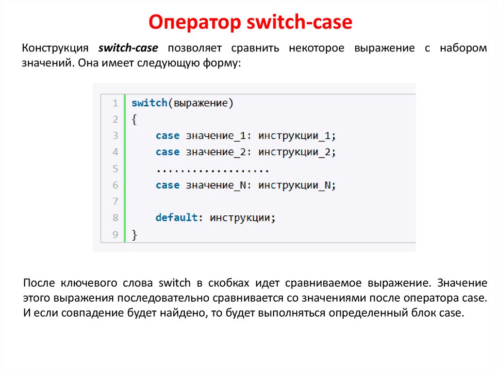 Оператор switch-caseКонструкция switch-case позволяет сравнить некоторое выражение с набором