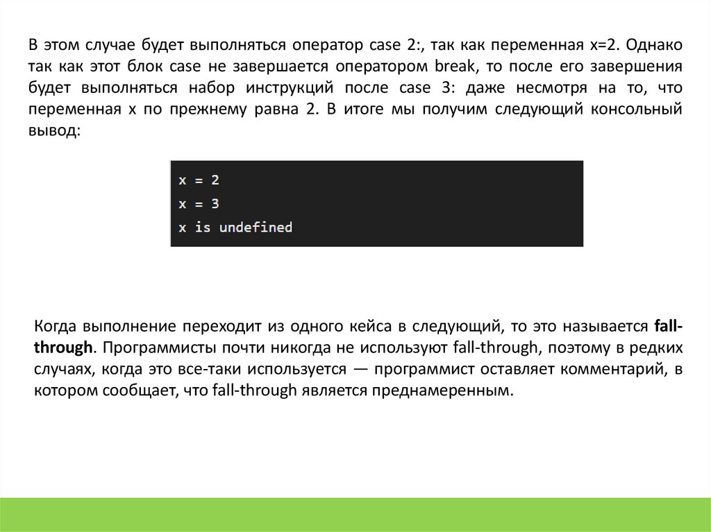 В этом случае будет выполняться оператор case 2:, так как переменная x=2. Однакотак как этот блок case не завершается оператором break, то после его завершения
