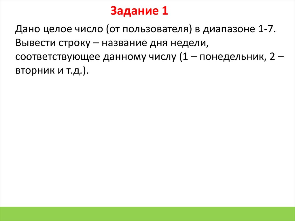 Задание 1Дано целое число (от пользователя) в диапазоне 1-7.