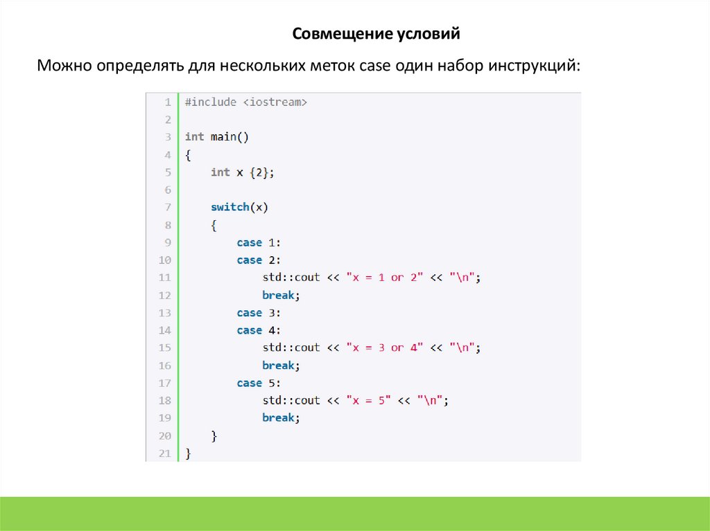 Совмещение условийМожно определять для нескольких меток case один набор инструкций: