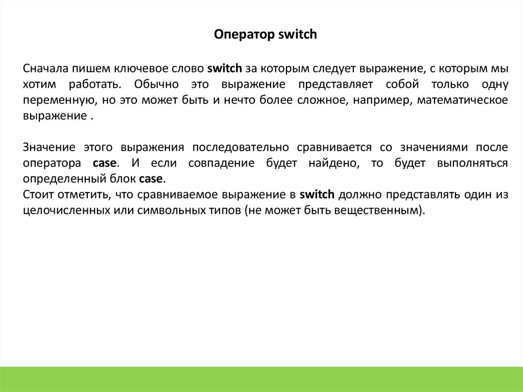 Стоит отметить, что сравниваемое выражение в switch должно представлять один из