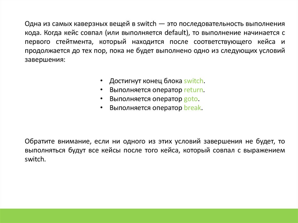 Одна из самых каверзных вещей в switch — это последовательность выполнениякода. Когда кейс совпал (или выполняется default), то выполнение начинается с