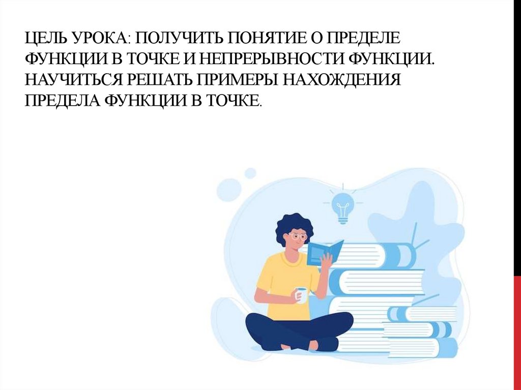 1. Цель урока: получить понятие о пределе функции в точке и непрерывности функции. Научиться решать примеры нахождения предела