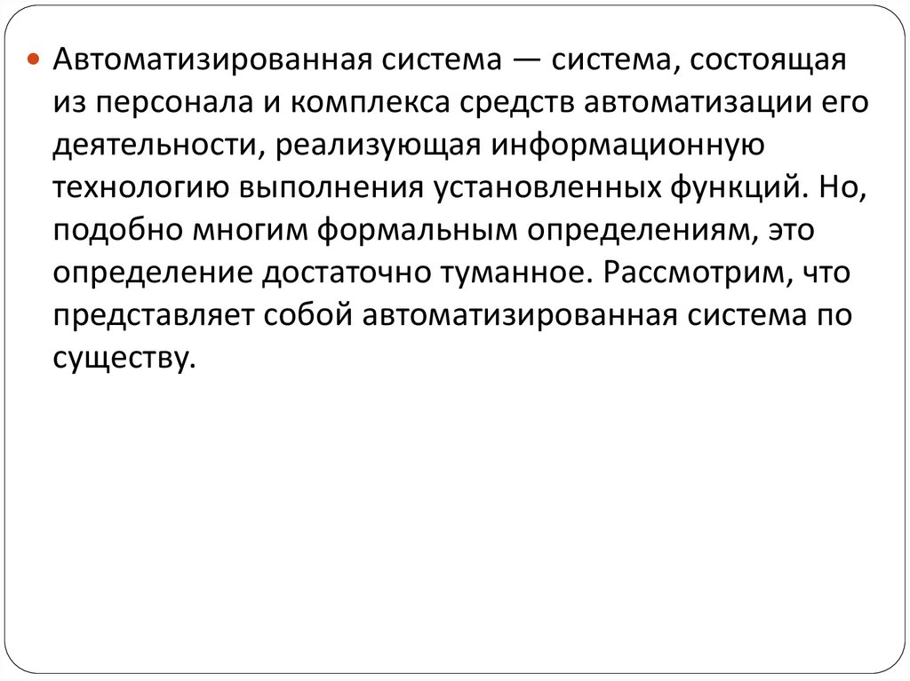 Автоматизированная система — система, состоящаяиз персонала и комплекса средств автоматизации его
