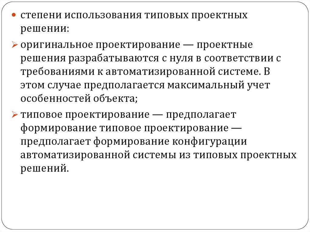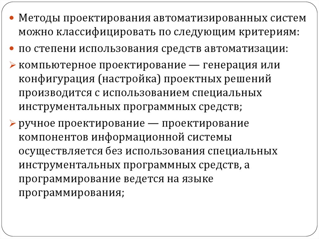 Методы проектирования автоматизированных системможно классифицировать по следующим критериям: