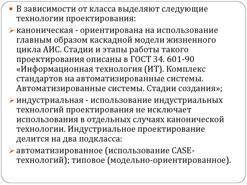 В зависимости от класса выделяют следующиетехнологии проектирования: