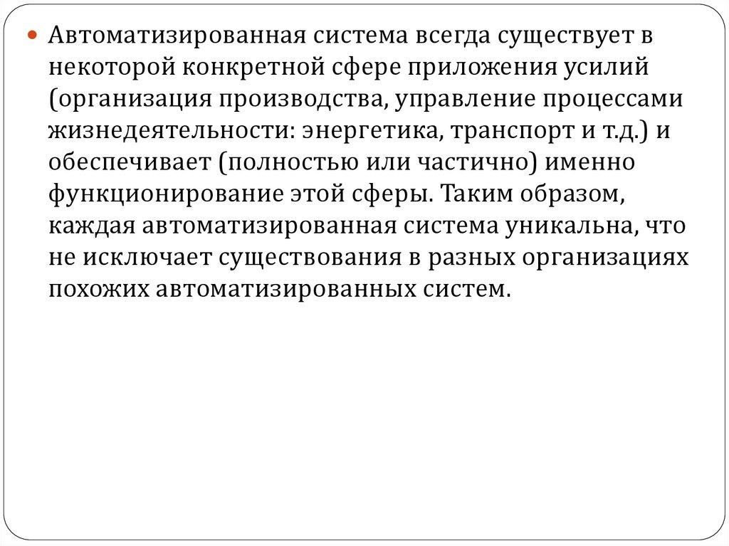 Автоматизированная система всегда существует внекоторой конкретной сфере приложения усилий