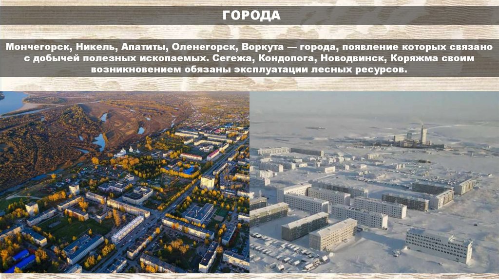 ГОРОДАМончегорск, Никель, Апатиты, Оленегорск, Воркута — города, появление которых связано