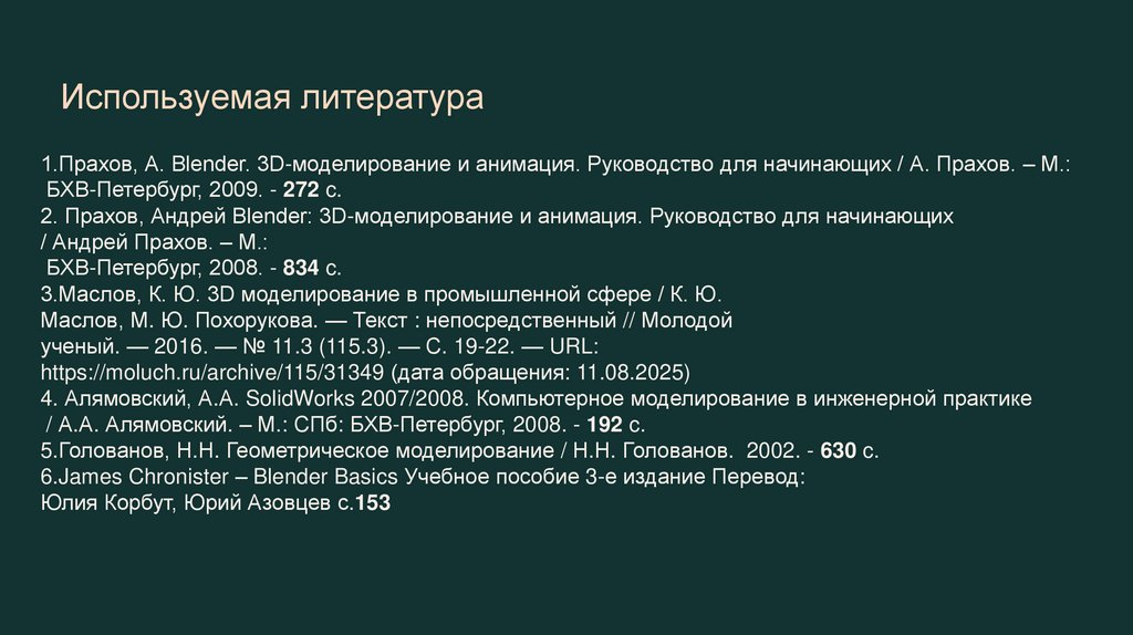 Используемая литература1.Прахов, А. Blender. 3D-моделирование и анимация. Руководство для начинающих / А. Прахов. – М.: