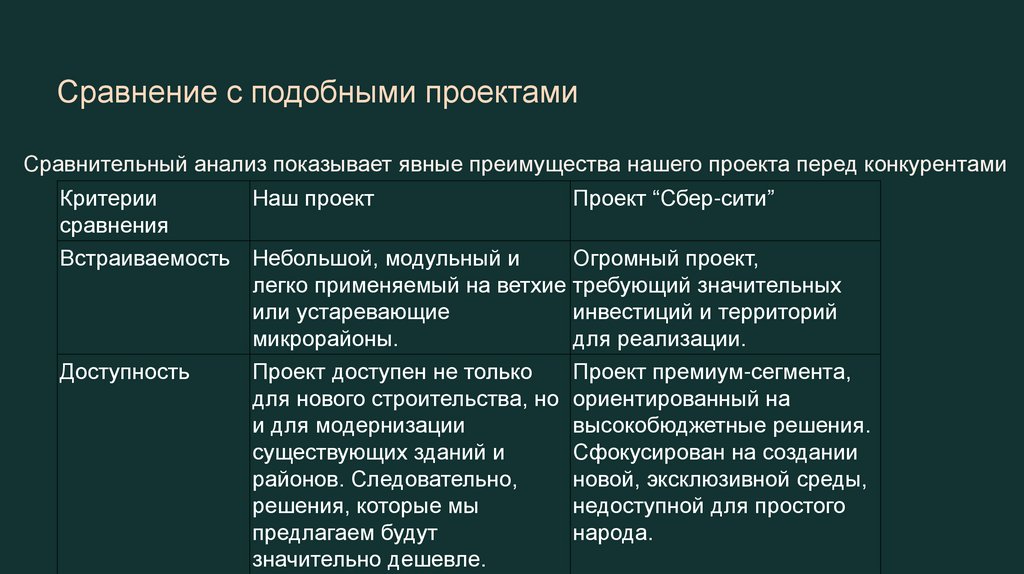 Сравнение с подобными проектамиСравнительный анализ показывает явные преимущества нашего проекта перед конкурентами