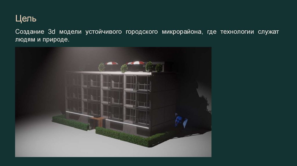 ЦельСоздание 3d модели устойчивого городского микрорайона, где технологии служат