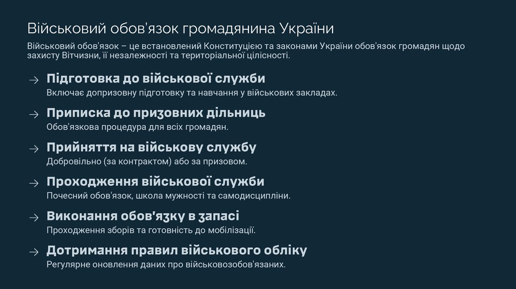 Військовий обов’язок громадянина УкраїниВійськовий обов'язок – це встановлений Конституцією та законами України обов'язок громадян щодо