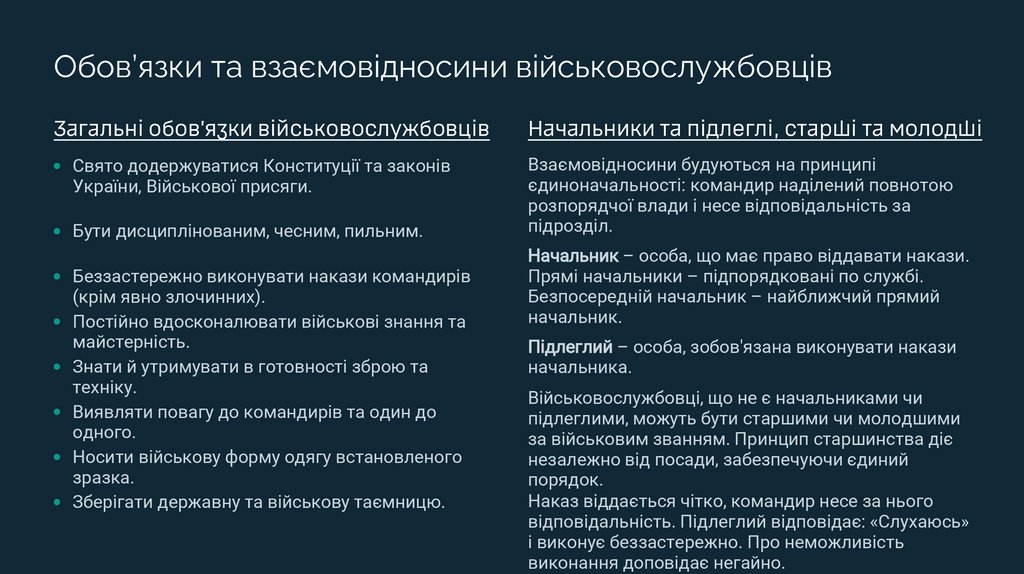 Обов’язки та взаємовідносини військовослужбовцівЗагальні обов’язки військовослужбовців